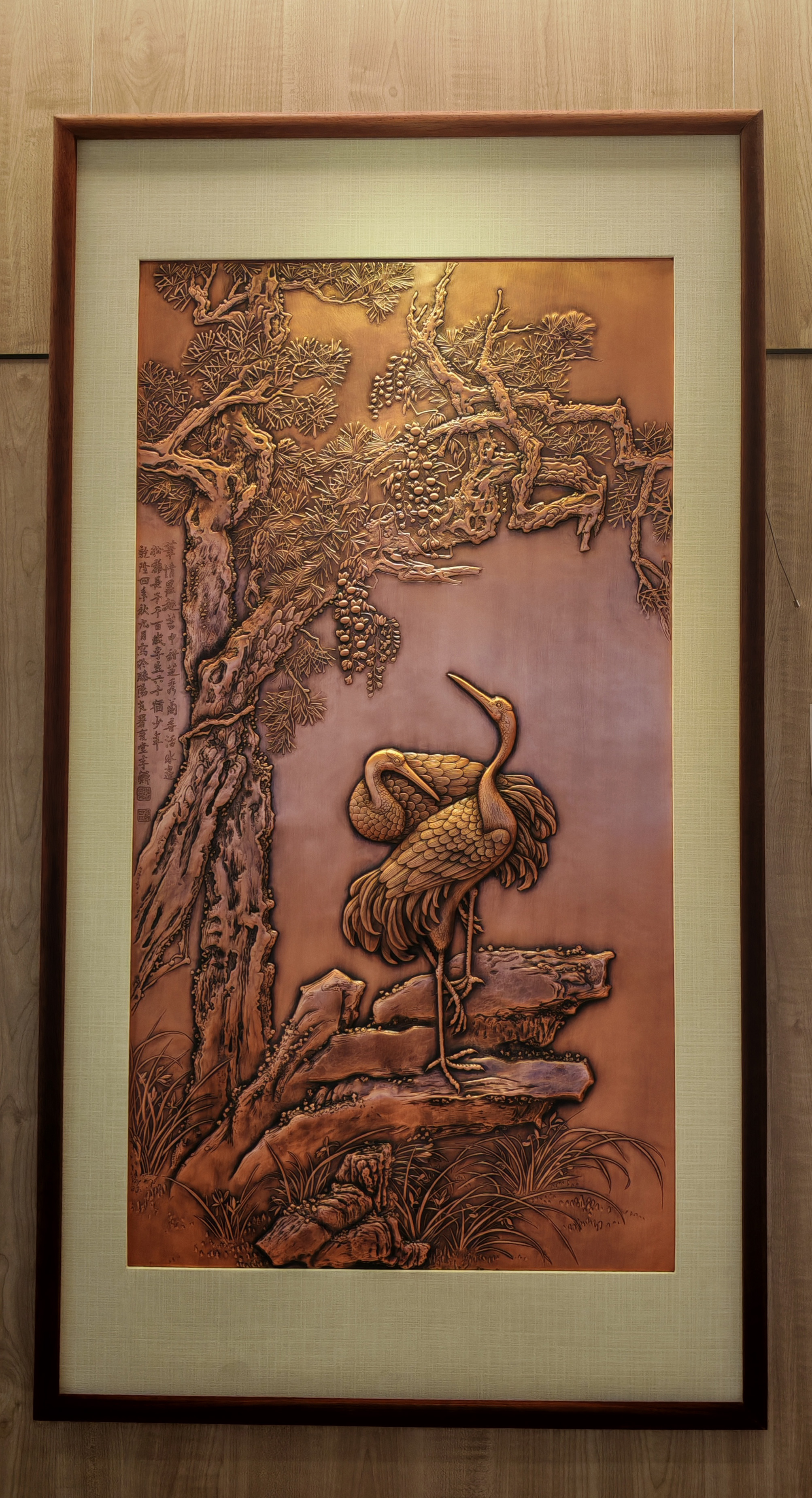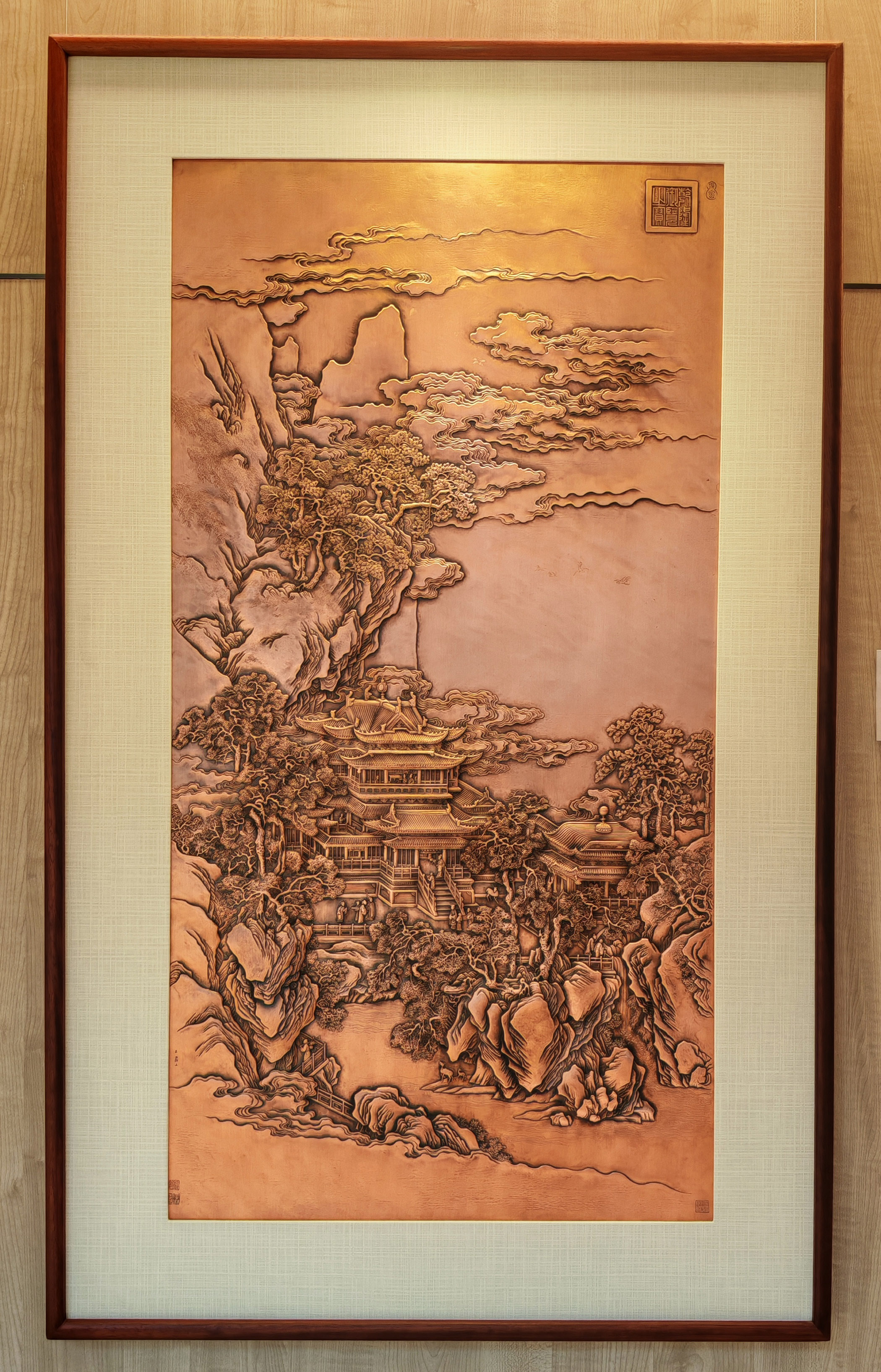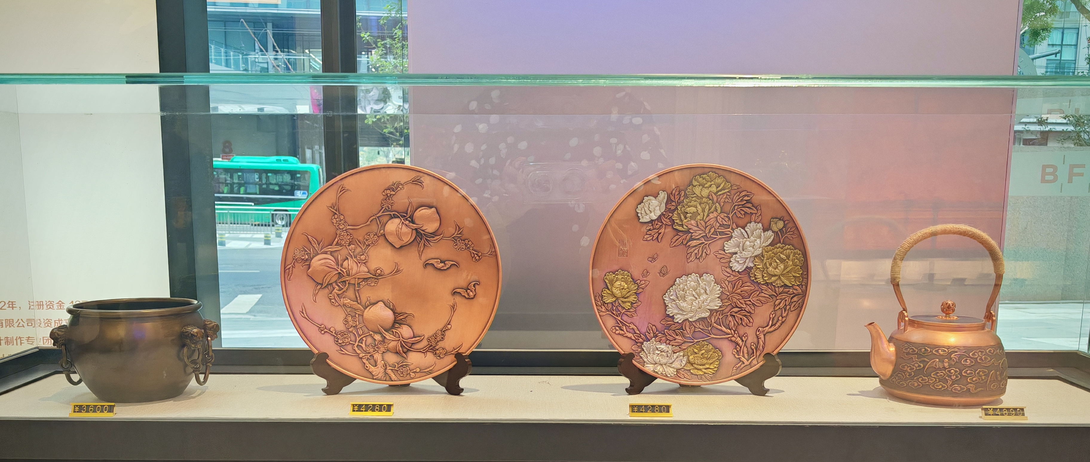 此次金属公司展示的作品,不仅有传统非遗金属锻錾工艺的铜壁画、铜屏风、铜火锅、铜赏盘、铜壶等精品,还有金属公司近年来顺应市场开发的车挂、琉璃饰品、笔筒、小摆件、香道产品等广受大众喜爱的文创产品。