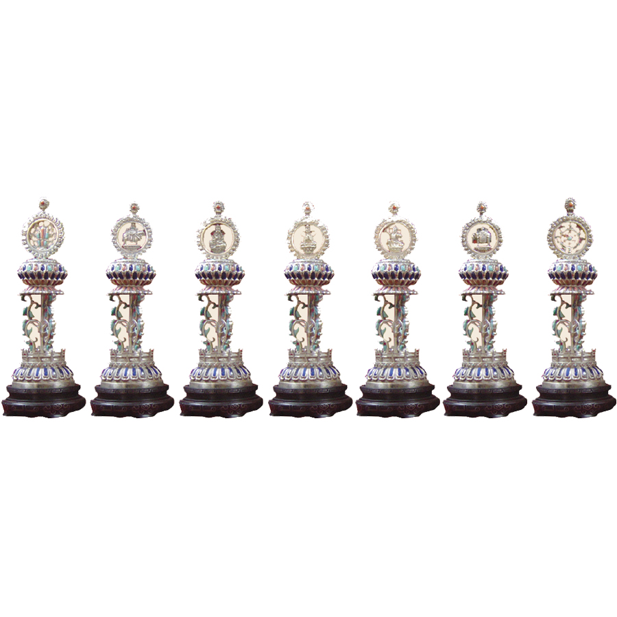 本品是仿故宫珍宝馆中的七珍制作的。七政宝包括:轮宝、象宝、马宝、珠宝、女宝、藏臣宝、兵臣宝。七珍八宝均为佛家的法器法宝,含有佛法无边,神通广大,普渡众生,如愿吉祥之意。产品选材采用纯天然材质如各种宝石,制作技艺精湛,属精品中的精品。