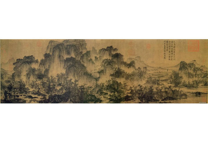 本作品取材自北宋李成的画作《茂林远岫图》。李成,李唐宗室后裔,少时博通经史、学识淹贯,因满怀抱负不得施展,故寄情于诗酒书画,与关仝、范宽并称北宋山水画三大家。