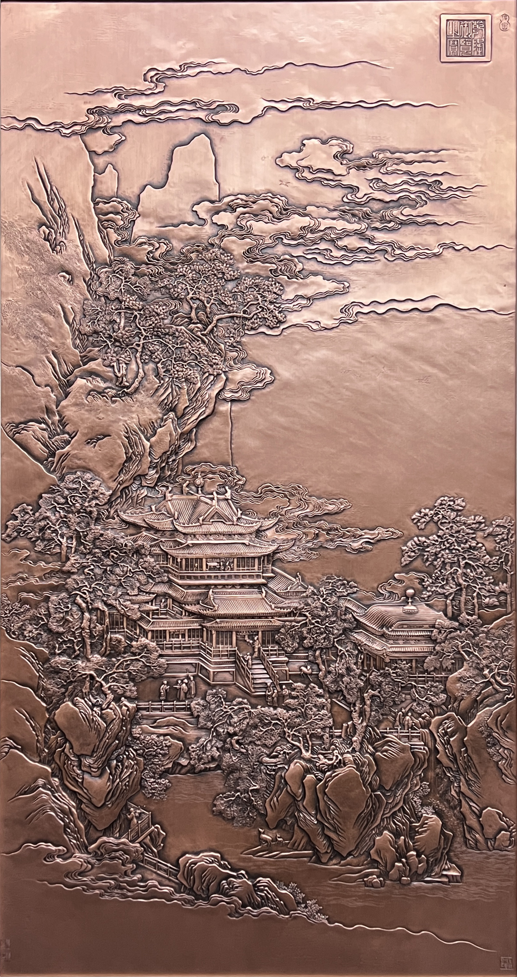 此紫铜壁画采用非遗工艺——金属锻錾——手工制作而成,做工极为精细,将人物神态、楼宇窗棂等细节一一呈现,工艺精湛,形神俱备,堪称精品。