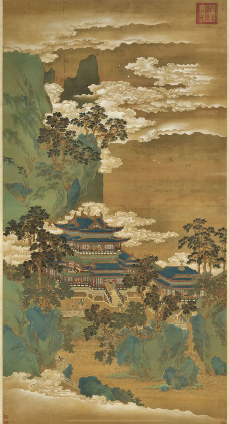 本作品取材自《仙山楼阁图》,相传为北宋赵伯驹所作,画面瑰丽,想象雄奇,极富浪漫主义色彩。赵伯驹是南宋时期青绿山水画的杰出代表之一,他的作品场面宏大,气势壮阔,在青绿山水画的发展史上举足轻重,对后世的山水画家产生了深远的影响,仇英、王希孟等一批著名画家都受到了他的画风的影响。