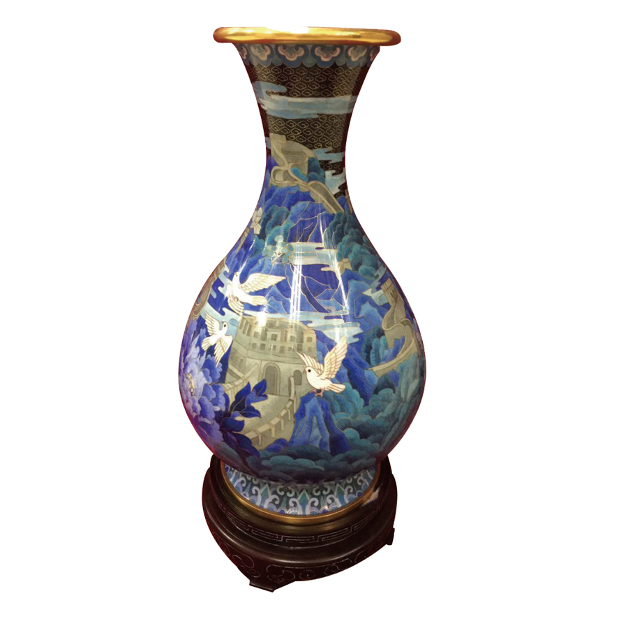长城脚下牡丹花盛开,鸽子自在的飞翔其中,象征伟大的祖国祥和美好,繁荣昌盛。