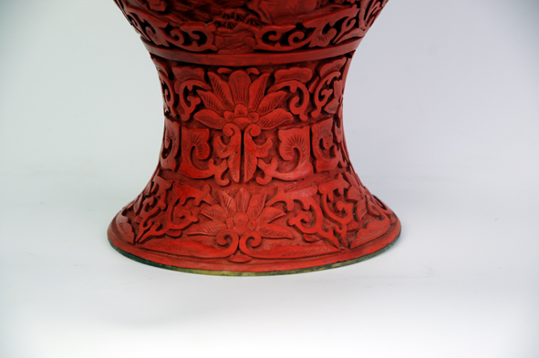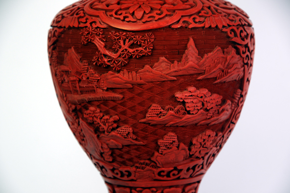 瓶身开窗为山水花鸟风景,瓶口及底足为传统纹饰,雕工精细,美观大方。