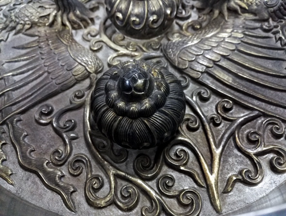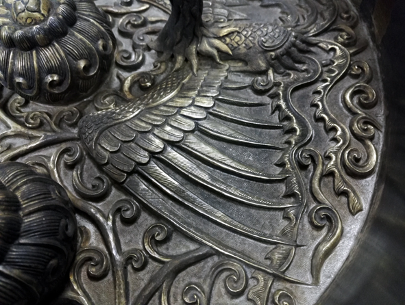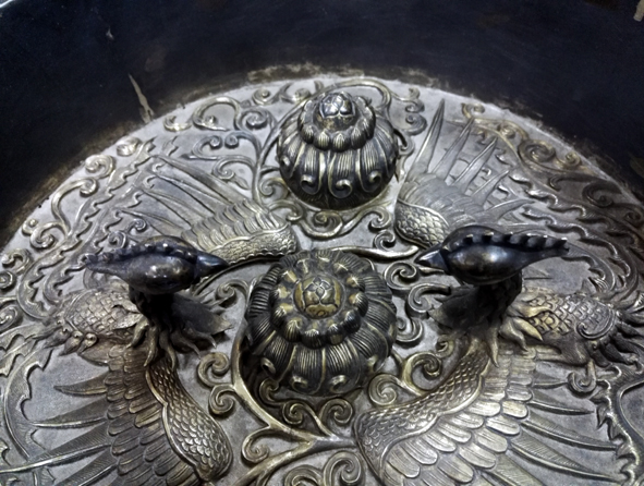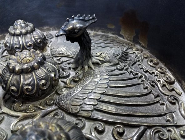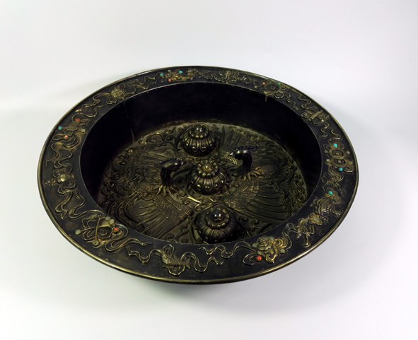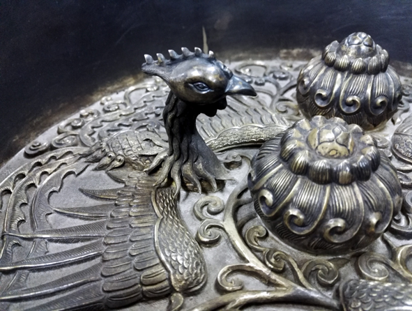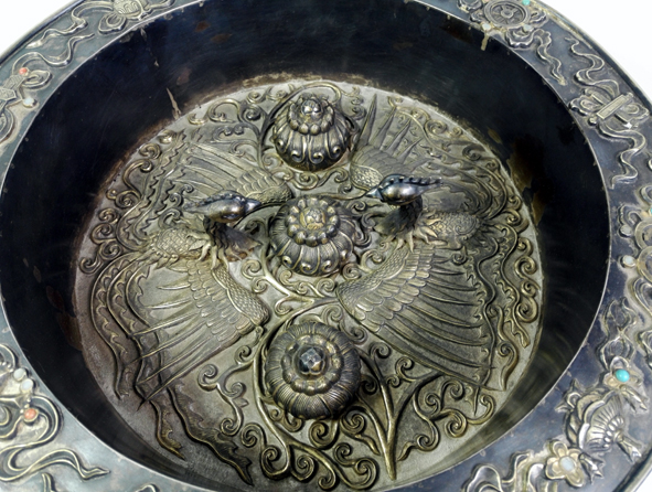 仿故宫清代金银器。原物为金胎,本企业制作的为纯银之材。制作时间为上个世纪八十年代,由我公司金属锻錾技艺第二代传承人、工艺美术大师康文昇高级技工制作。盆边錾镌十二杂宝吉祥图案,并镶嵌各种高档宝石。底内后嵌,錾镌花纹中立双凤和三朵宝相花。